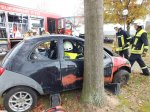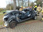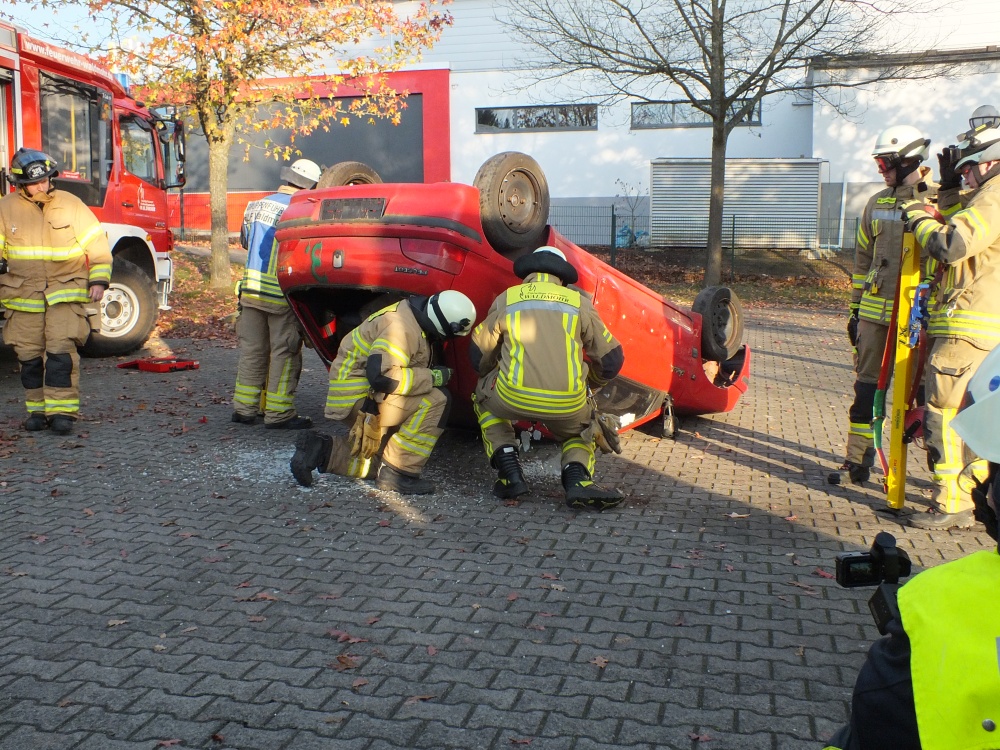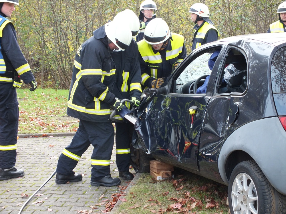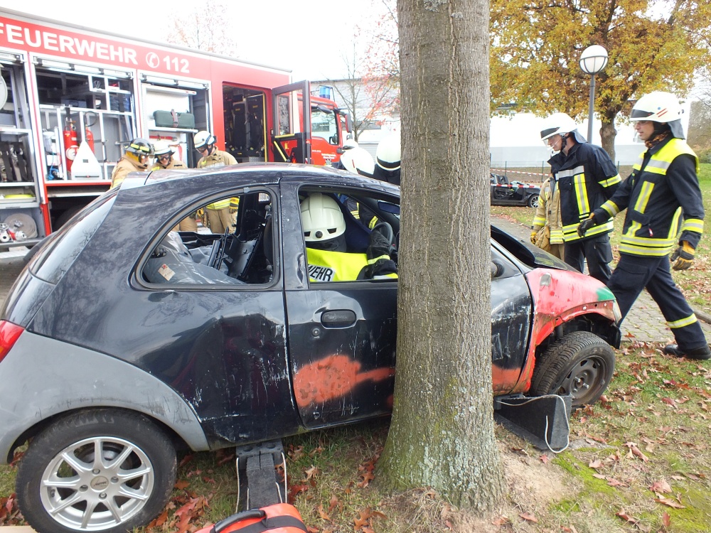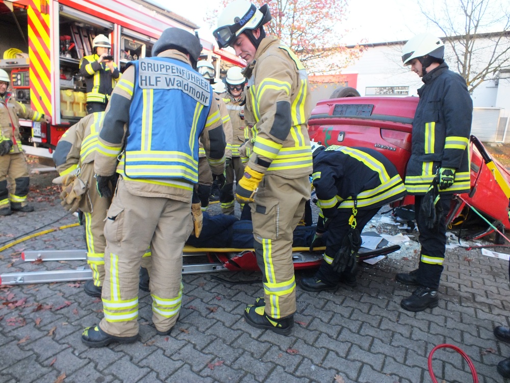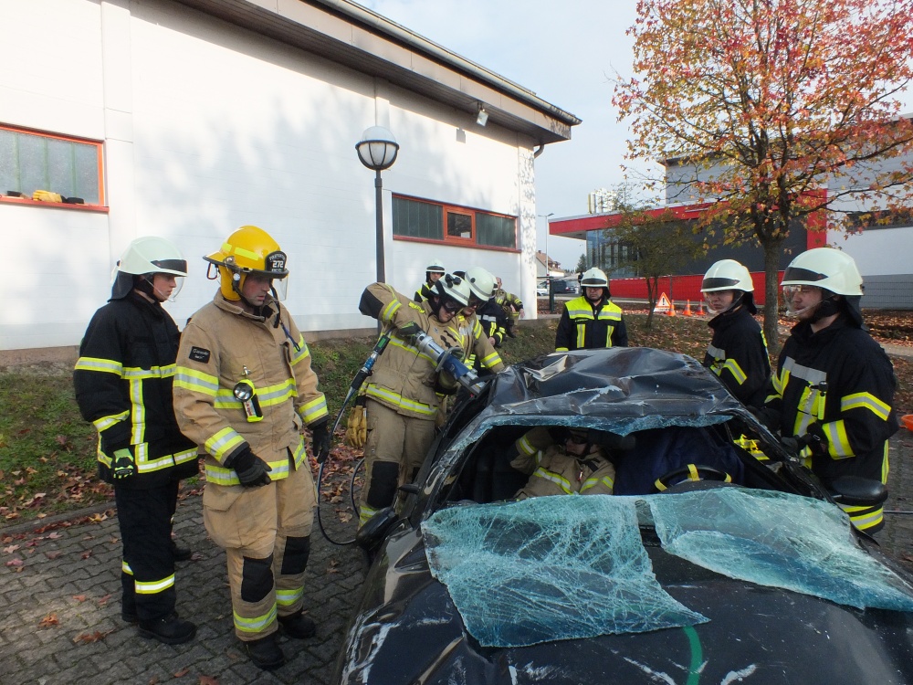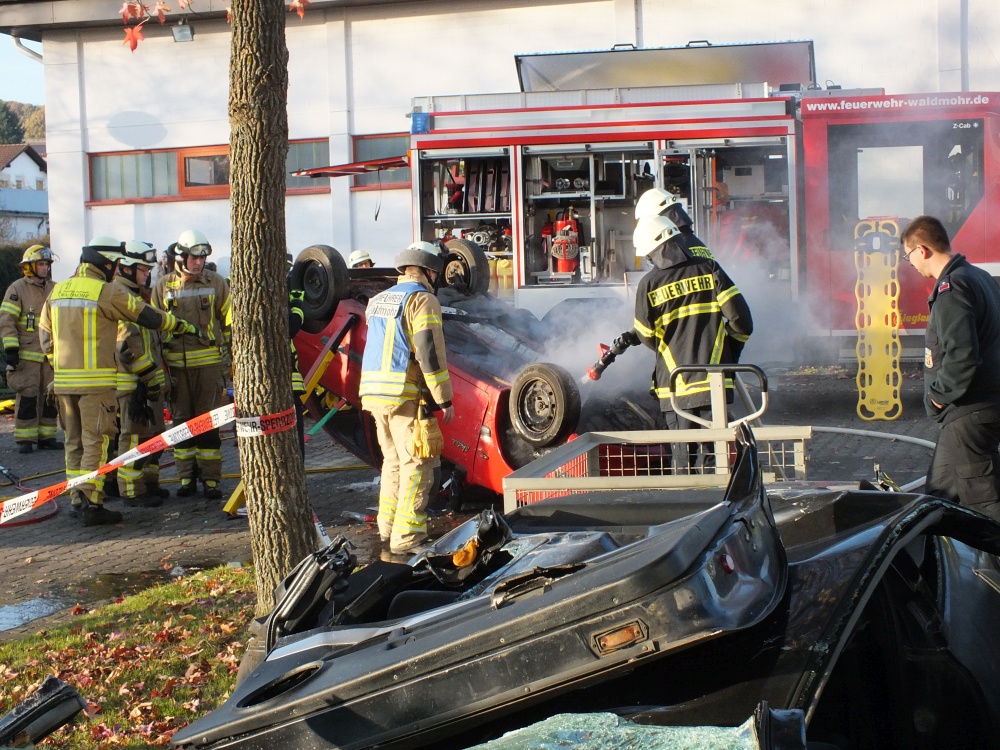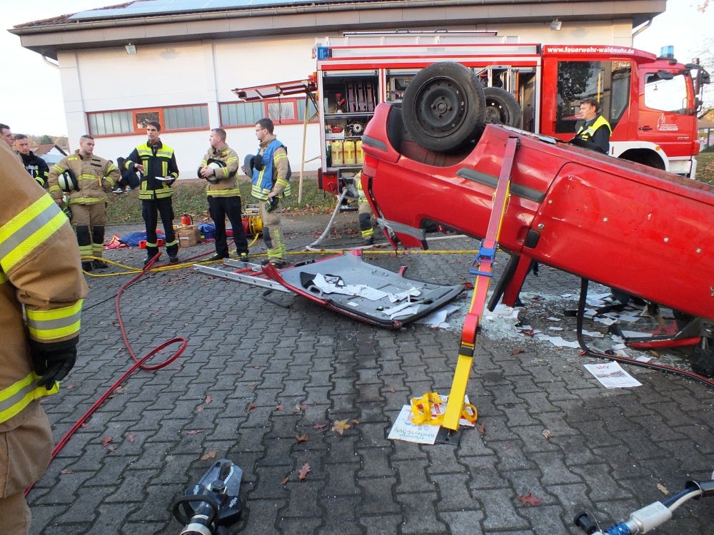 Das Ausbilderteam, bestehend aus Michael Geyer, Mario Leibrecht, Alexander Wemmert und Markus Jung hatte sich im Vorfeld wieder viele Gedanken gemacht, wie man die Thematik am besten vermitteln kann. Nach einer kurzen theoretischen Auffrischung der Grundlagen durch Michael Geyer wurden auf dem Außengelände vier praxisnahe Einsatzübungen durchgeführt. Im Einzelnen wurde - unter Vornahme von hydraulischem Rettungsgerät und andere technischen Hilfsmitteln- die Personenrettung beim Szenario „PKW gegen Baum, PKW auf der Seite und PKW auf dem Dach“ geübt. Die Übungsszenarien steigerten sich von Übung zu Übung in ihrem Schwierigkeitsgrad. Gerade bei der letzten Übung setzte die Feuerwehr viele unterstützende Rettungsmittel wie beispielsweise Stab Fast System zur Sicherung gegen Umkippen von PKWs oder auch druckluftbetätigte Hebekissen ein. Während der Übungen wurden Einsatzfahrzeuge beider Feuerwehren, Waldmohr und Schönenberg-Kübelberg benutzt. Somit konnten sich die Kameraden von Schönenberg und Waldmohr einen Eindruck verschaffen, welche Materialien und Werkzeuge in den jeweiligen Wehren vorgehalten werden.
