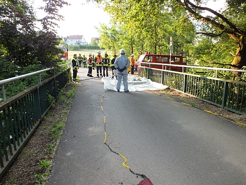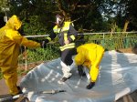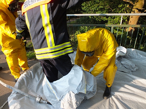 Mit Hilfe von Sicherheitsdatenblatt und Gefahrstoffdatenbank leitete die Feuerwehr dann Erstmaßnahmen ein um das weitere Austreten des Stoffes zu verhindern. Mit einem Behälter und später einer Plane wurde der Stoff abgedeckt. Zusätzlich wurde an der Absperrgrenze eine Trockendekontaminationsstelle eingerichtet. Alle Personen, die sich im Gefahrenbereich befanden mussten durch diese "Schleuse" gehen um danach wieder in den ungefährdeten Bereich zu gelangen.